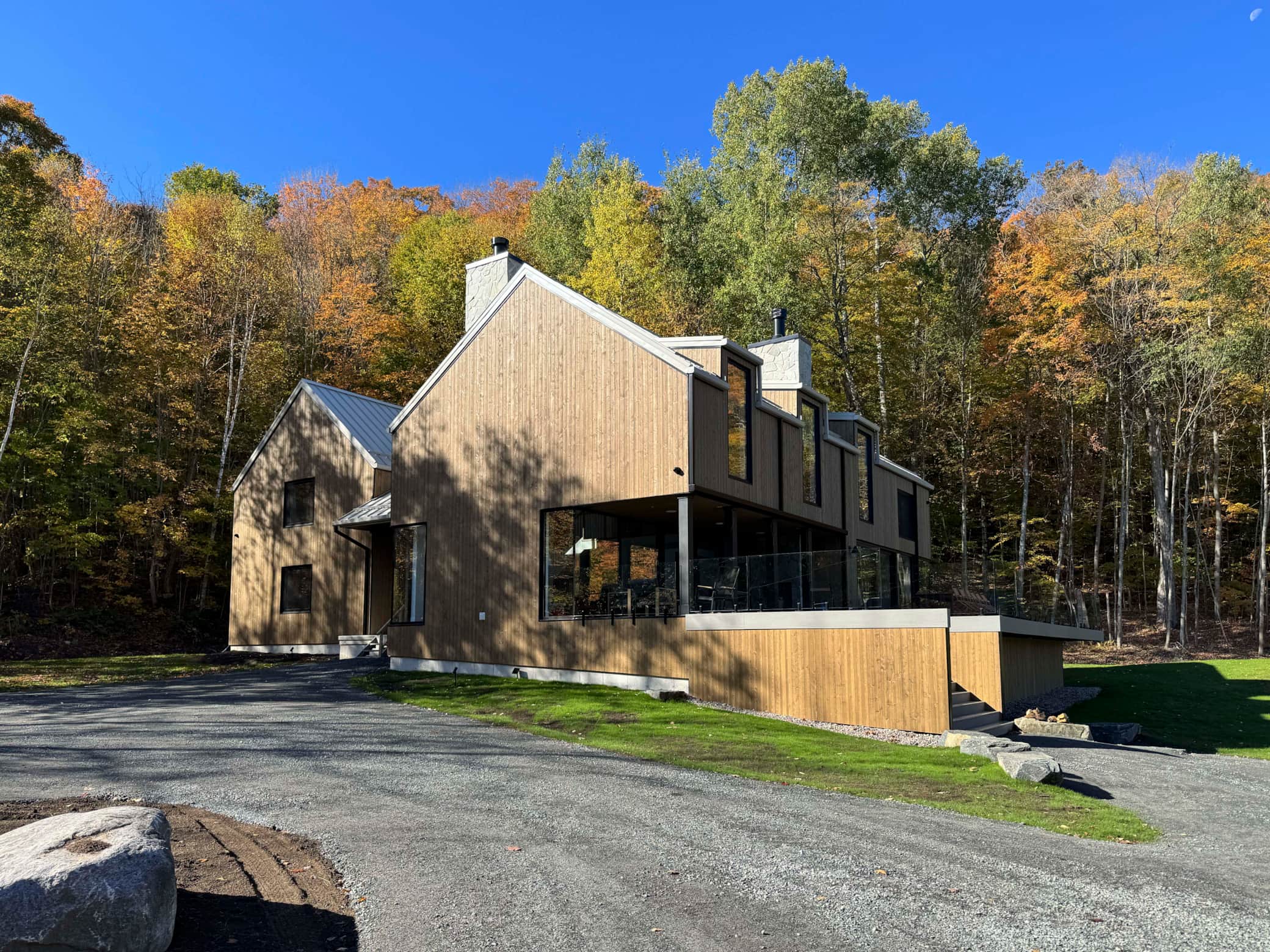 Clean architectural lines, vaulted ceilings, and floor-to-ceiling windows flood the space with natural light. Every room is intentionally designed with wood finishes, minimalist touches, and cozy corners. A stone fireplace in the great room and a second wood-burning hearth in the covered porchinvite you to settle in and slow down.